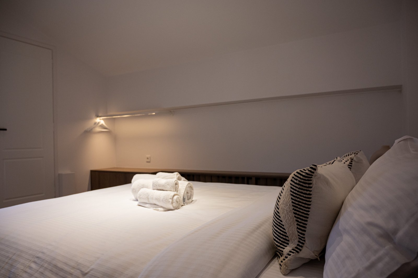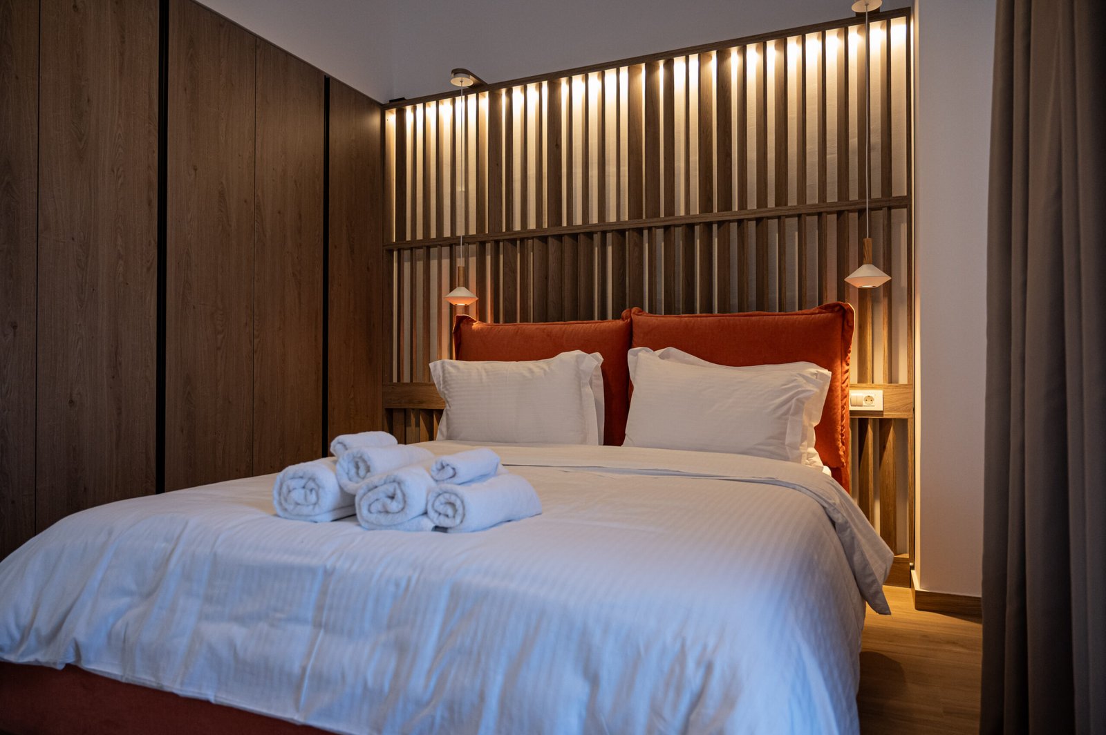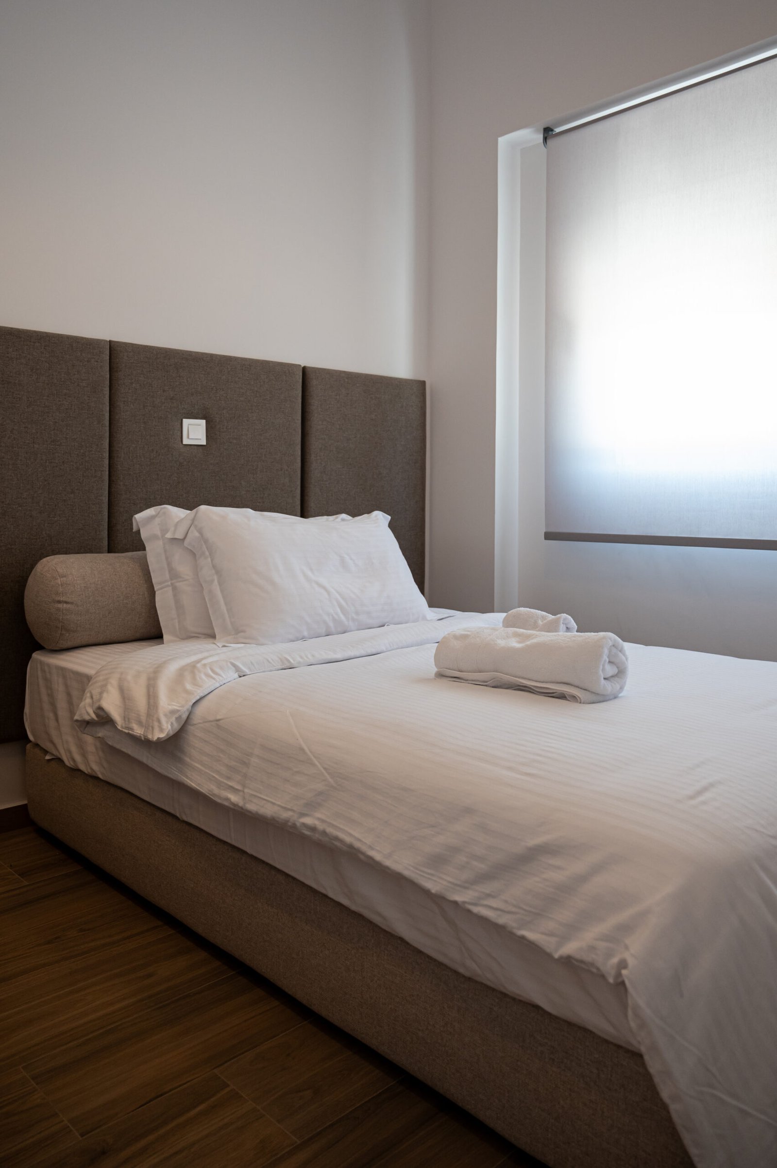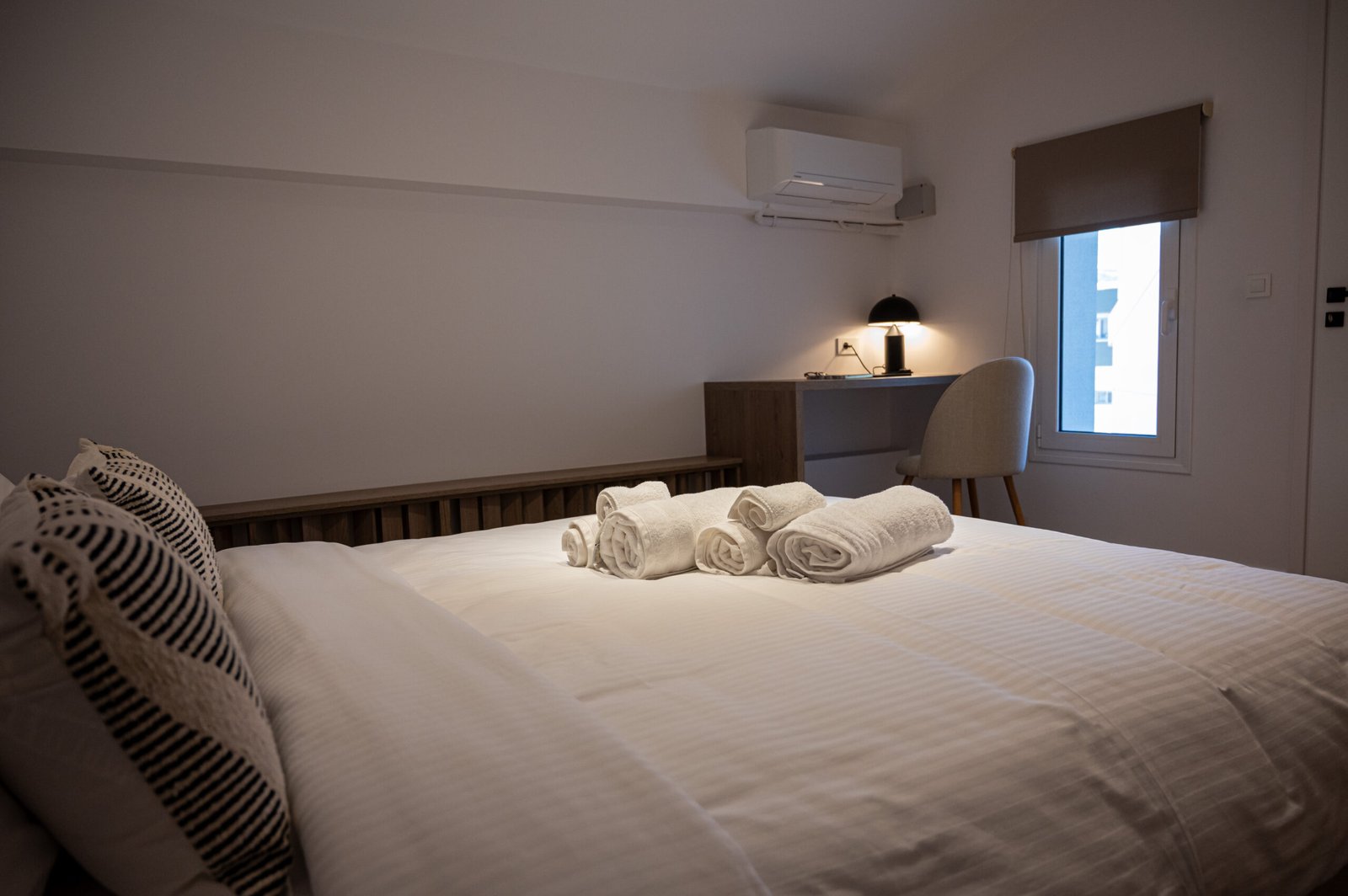 Spacious double bedroom with a private balcony. Includes a double bed, large wardrobe, bedside tables, and plenty of natural light.