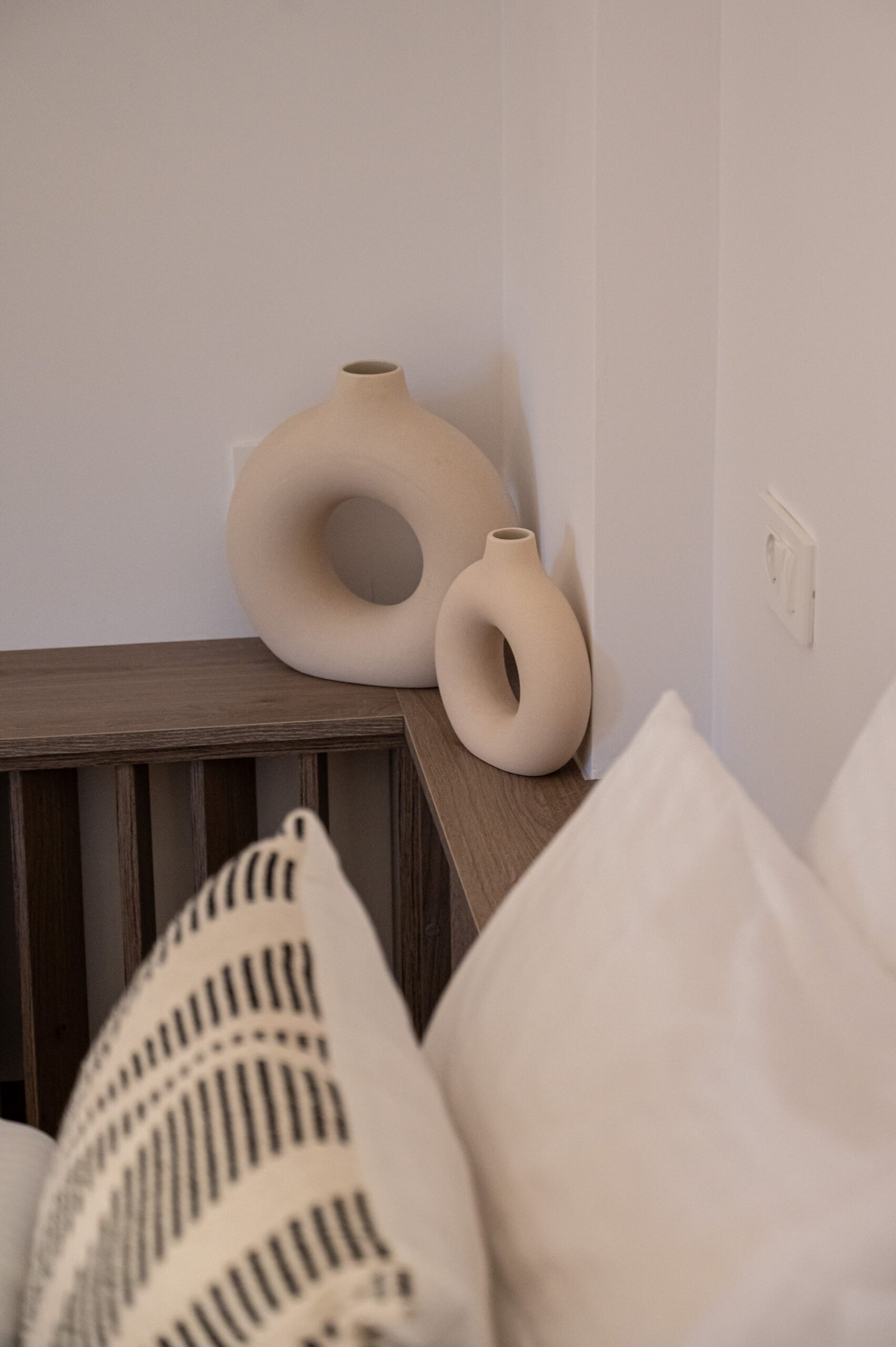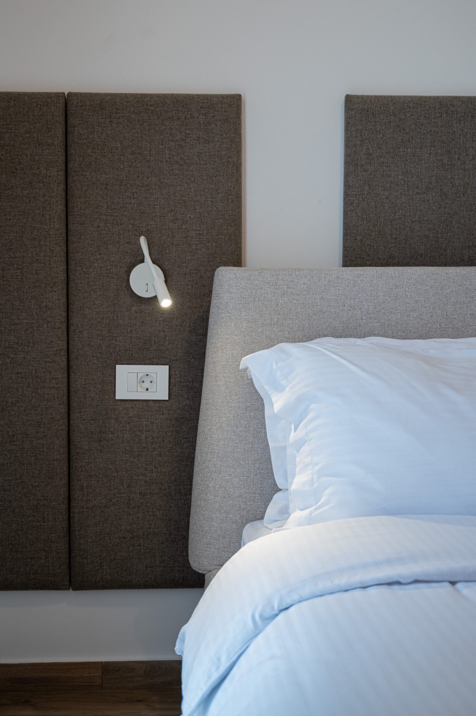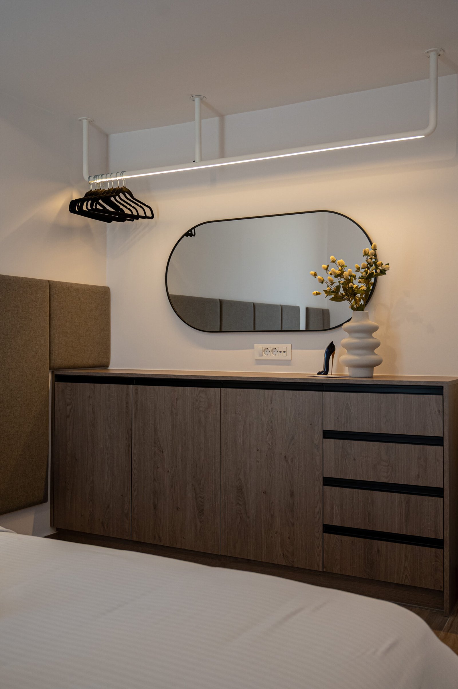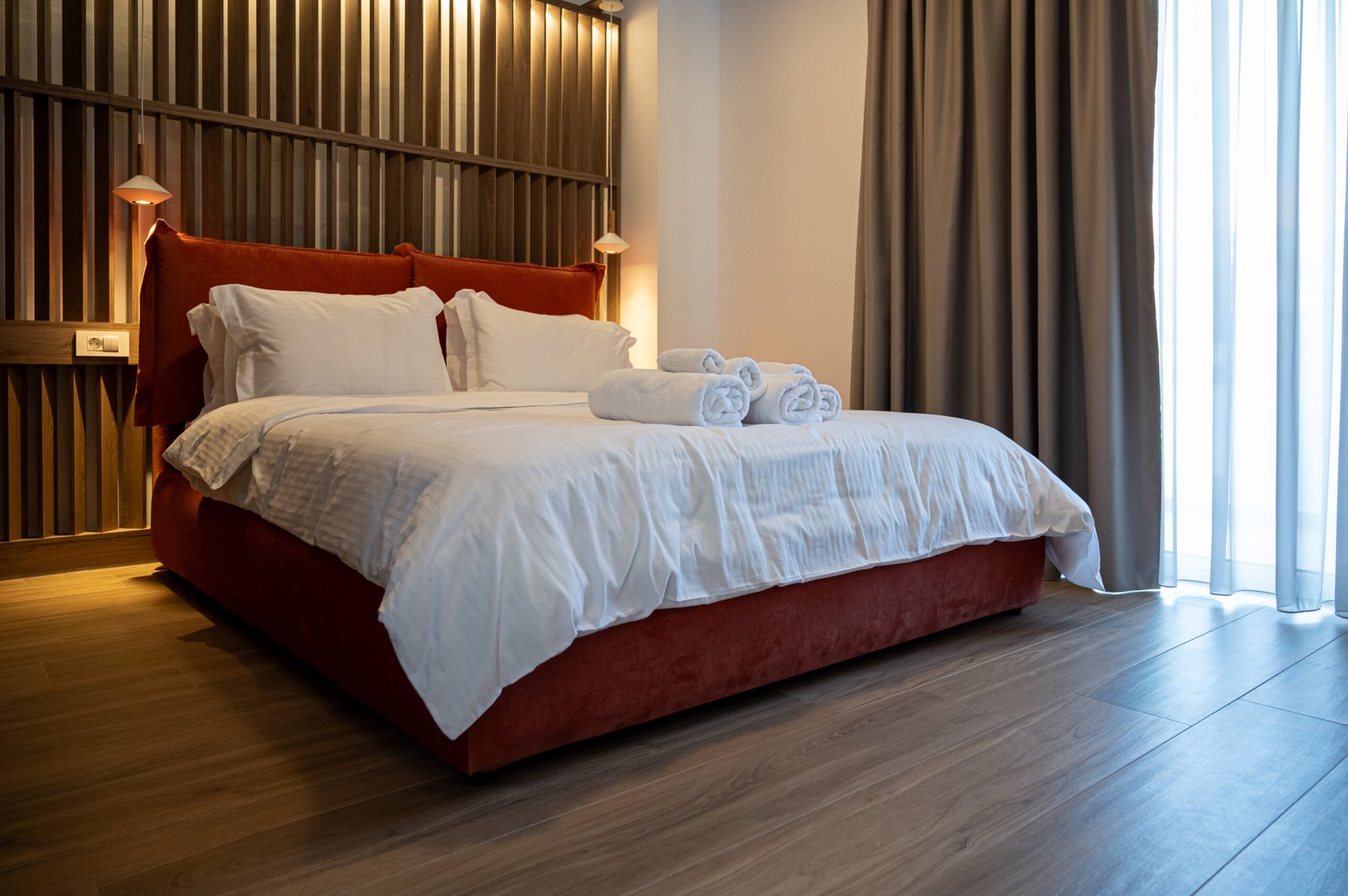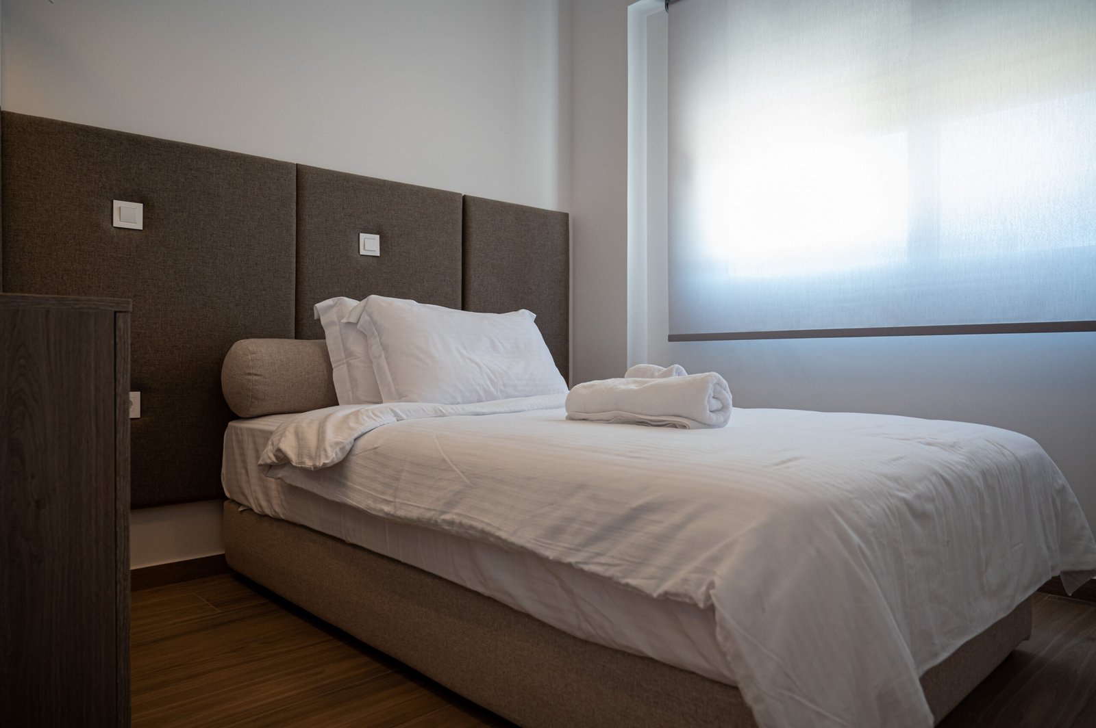 Bright double bedroom with direct access to a private balcony. Features a double bed, a big wardrobe, and bedside tables